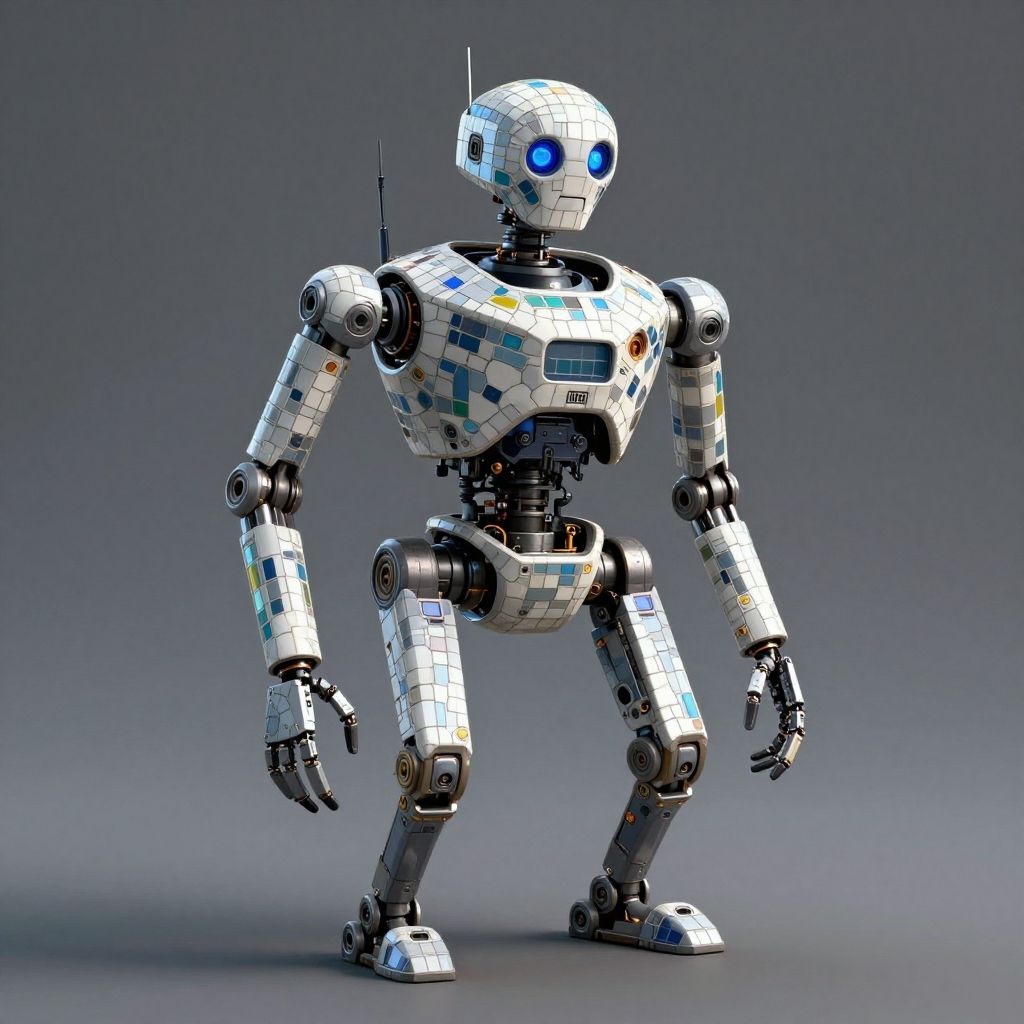 Photograph of a humanoid robot standing against a gradient gray background. The robot has a white, pixelated, and mosaic-like exterior with blue glowing eyes and various colored circuit patterns on its body. It has a sleek, metallic build with articulated joints, allowing for a wide range of motion. The robot's head features a small antenna on the left side, and its right arm is slightly bent at the elbow. The overall design is futuristic and modern, with a combination of sharp and rounded edges, emphasizing its robotic nature. The lighting highlights the textures and patterns on its surface.