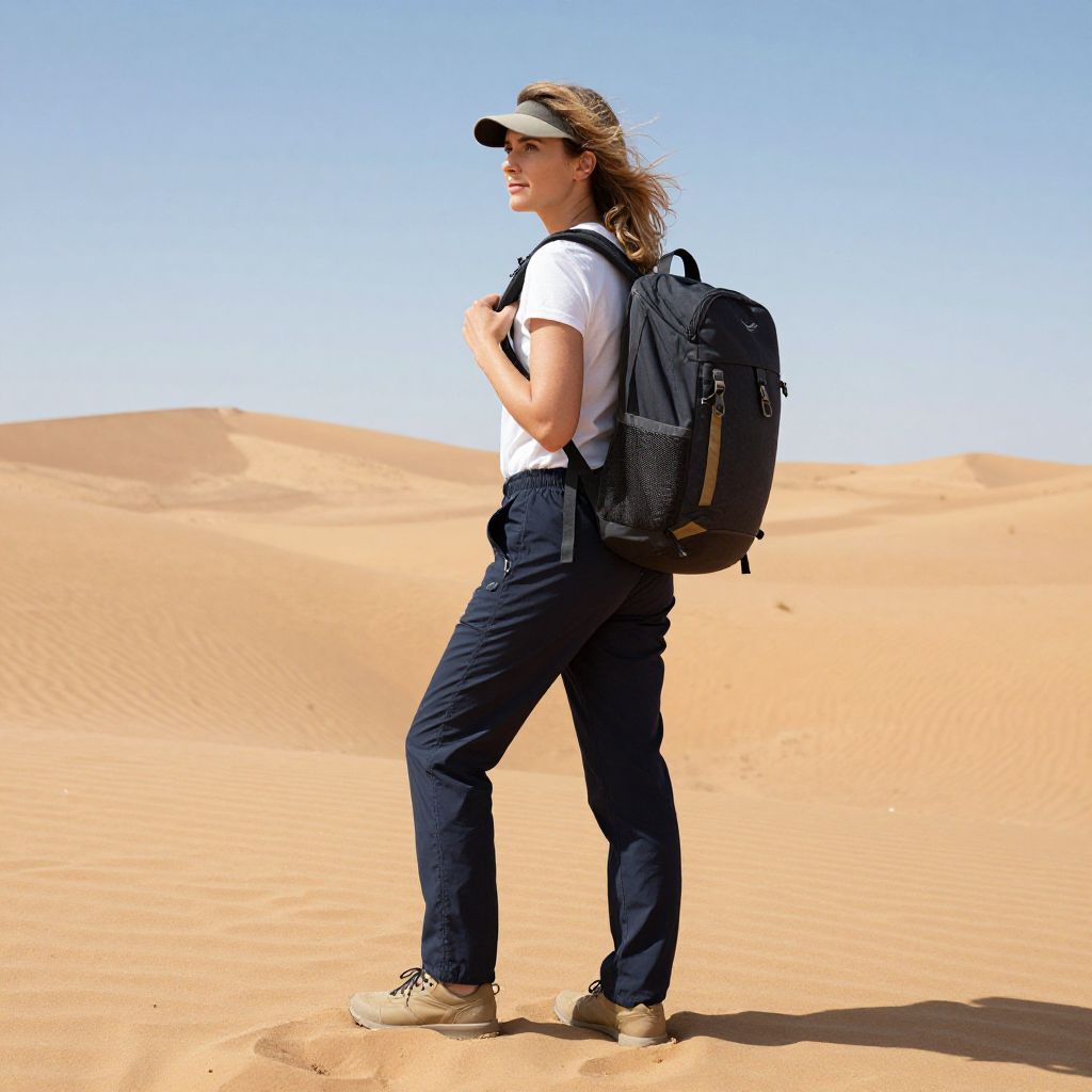 "Woman Xkg Ridge Pant, woman standing in the desert with a backpack"
