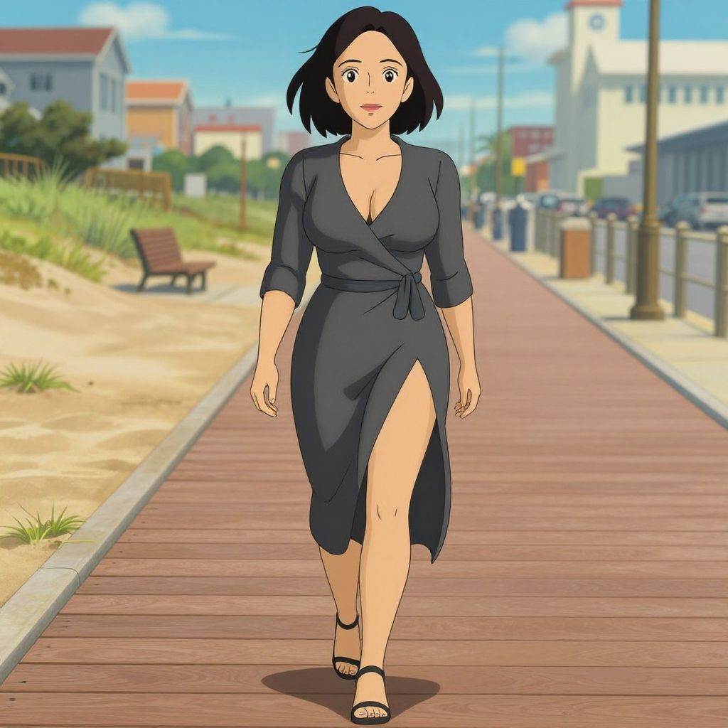 A woman, in a modern charcoal gray wrap dress with a thigh-high slit and black strappy heels, walking along a fashionable boardwalk in Virginia Beach, captured in a Studio Ghibli visual style. Sexy. Pretty face and beutiful eyes Sexy. Pretty face and beаutiful eyes. Big breasts