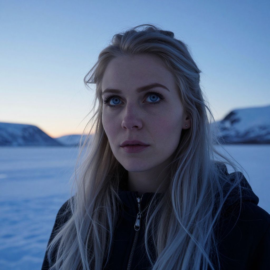 Portrait of a Nordic woman with piercing icy blue eyes and long silver streaked blonde hair, standing in a snow-covered Arctic landscape at twilight. Captured from a low angle, her serene expression contrasts with the vast, pristine snowscape under the soft glow of the midnight sun. She wears a dark winter jacket, highlighting her distinctive facial features framed by the cold, blue-toned natural light.