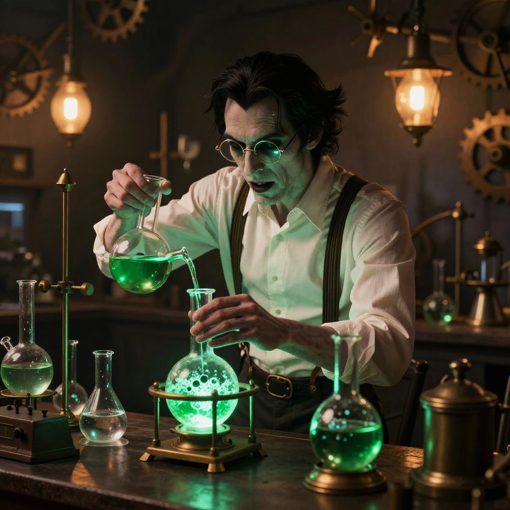 A vampire with glasses in a dimly lit laboratory filled with scientific instruments and glowing green potions, mixing a mysterious elixir, wearing a white shirt and suspenders, pale skin illuminated by eerie lights, steampunk influences, richly detailed and textured environment.