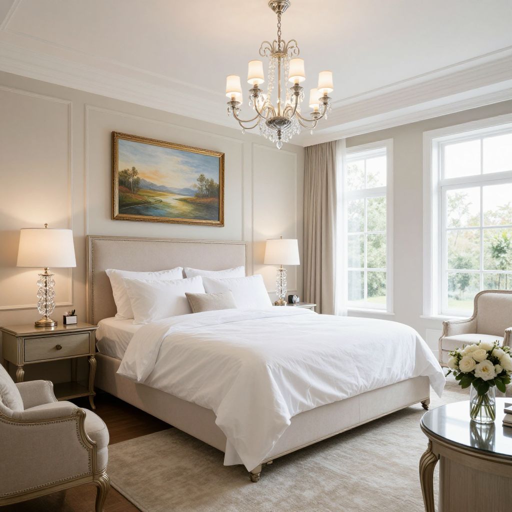 Elegant master bedroom showcases a luxurious ambiance with a plush king-sized bed adorned in crisp white linens, flanked by two matching bedside tables each featuring a crystal lamp, complemented by a grand chandelier above and a serene landscape painting on the wall, while soft natural light streams through large windows dressed in beige curtains, accompanied by a cozy armchair and side table with a floral arrangement.