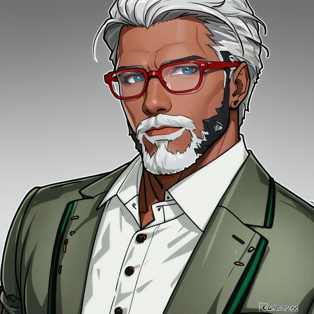 Arurandeisu, holostars, 1boy, mature male, beard, green eyes, grey eyes, glasses, red-framed eyewear, grey hair, short hair, white hair, collared shirt, virtual youtuber, virtual youtuber, goatee, by artist nonamejd, animagine