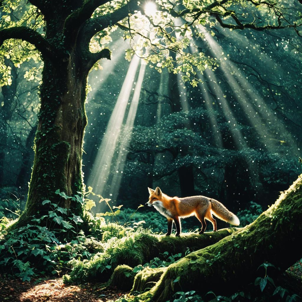 No humans, nature, animal, signature, realistic, outdoors, ancient oak, forest, dewy emerald, ivy, fox, animal focus, dog, sunlight, leaf, moss, scenery, light rays, day
