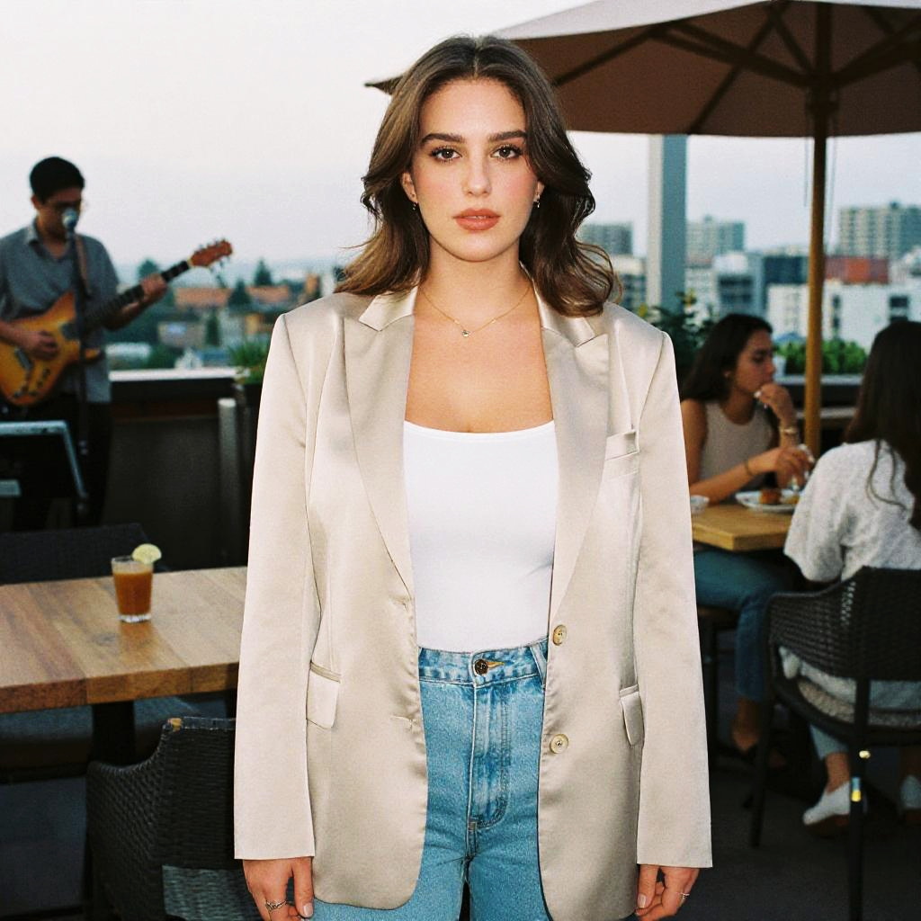 A Pear-shaped body type woman, dressed in a cream satin blazer with a single button and jeans in a light blue wash, stands elegantly at a rooftop eatery with live music, embodying a casual chic style. She wears a plain white top beneath the blazer, minimal jewelry, and has understated makeup, all captured in the nostalgic tones of Eastman film stock. Sexy. Pretty face and beаutiful eyes. Big breasts