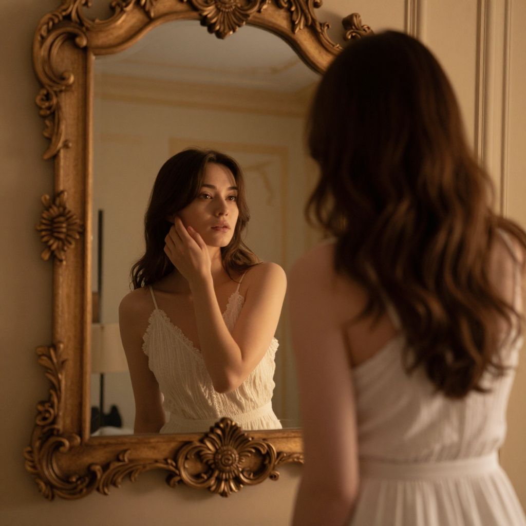 Photograph of a young woman with long, wavy dark brown hair, standing in front of an ornate, golden-framed mirror. She is wearing a white, sleeveless, lace-trimmed dress. Her right hand gently touches her face as she gazes into the mirror with a contemplative expression. The mirror reflects her face and upper body, highlighting her light skin tone. The background is softly lit, showing an elegant, cream-colored wall with subtle molding. The lighting creates a warm, intimate atmosphere, casting gentle shadows that enhance the texture of her dress and the intricate details of the mirror frame.