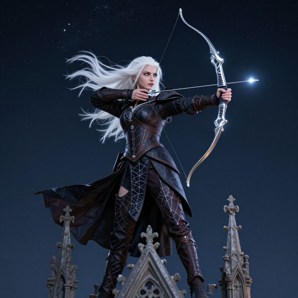 Beautiful drow archer perched atop a gothic spire under starry night sky, long white hair whipping in the wind, elegant dark leather armor with spiderweb patterns, aiming a silver bow with glowing arrows, dramatic lighting highlighting sharp features, fantasy epic scene.