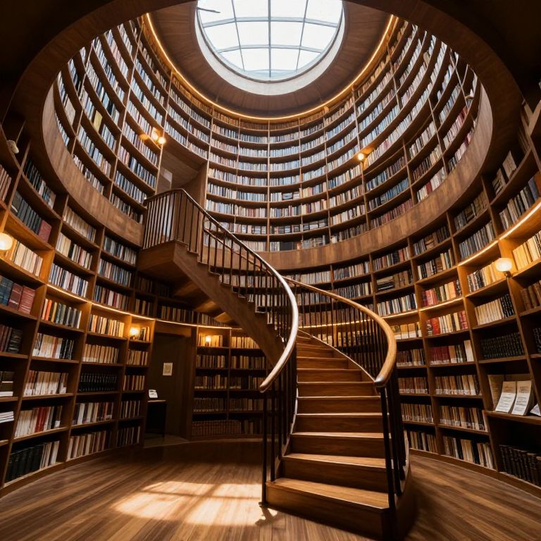 Spiraling wooden stairs ascend through a grand, circular library, illuminated by natural light streaming through a central skylight, surrounded by concentric shelves brimming with books and punctuated by warm lamplights casting soft shadows on polished floors.