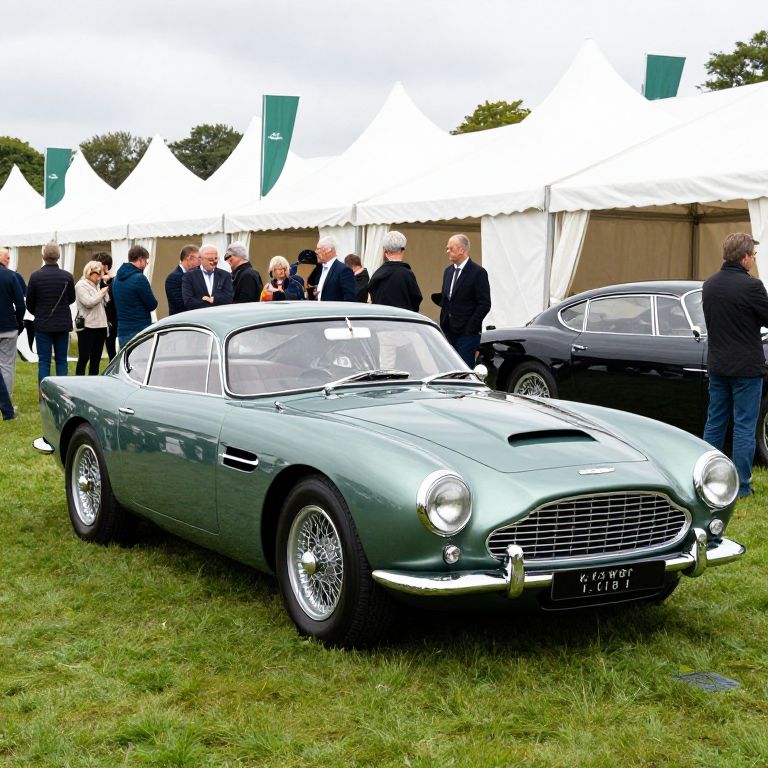 Classic green Aston Martin DB4GT Zagato showcased at the 2018 Bonhams Goodwood Festival of Speed Sale, surrounded by spectators and set against a backdrop of white tents and green flags.