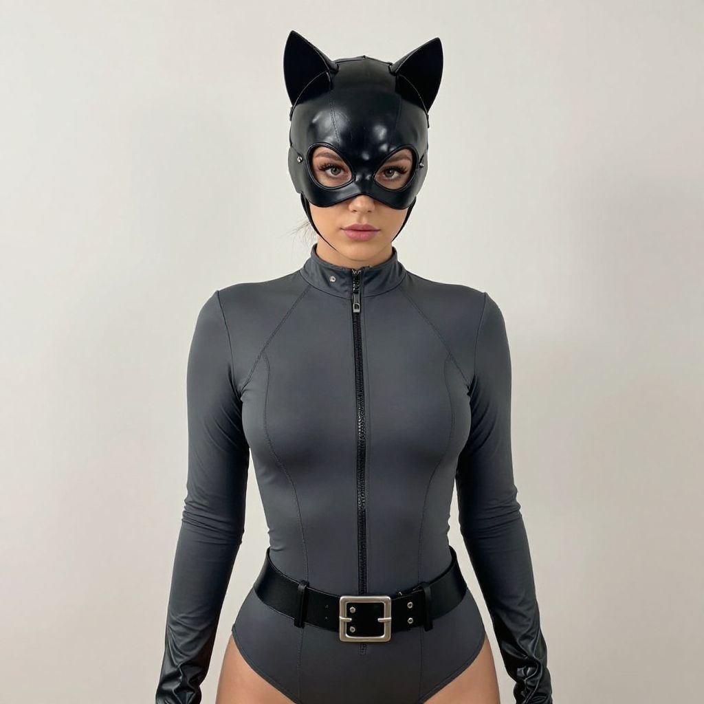 "catwoman gray suit costume, 1girl, solo, bodysuit, mask, belt, gloves, breasts, animal ears, black bodysuit, standing, medium breasts, superhero Realistic photo of casual sexy person with pretty face"