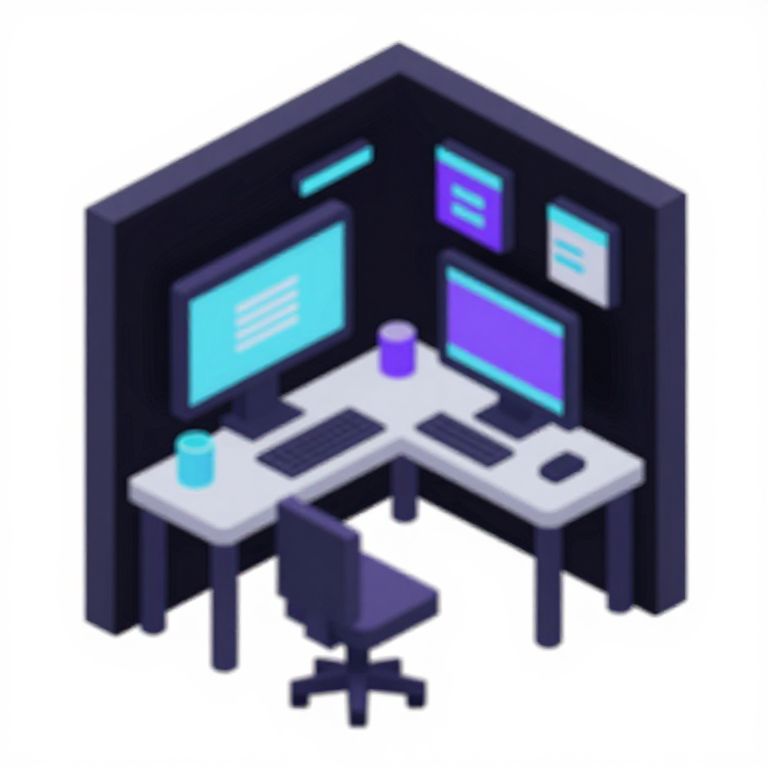 Shallow Depth Of Field isometric software developer home office, small room, low poly, 8bit art, black purple cyan neon,