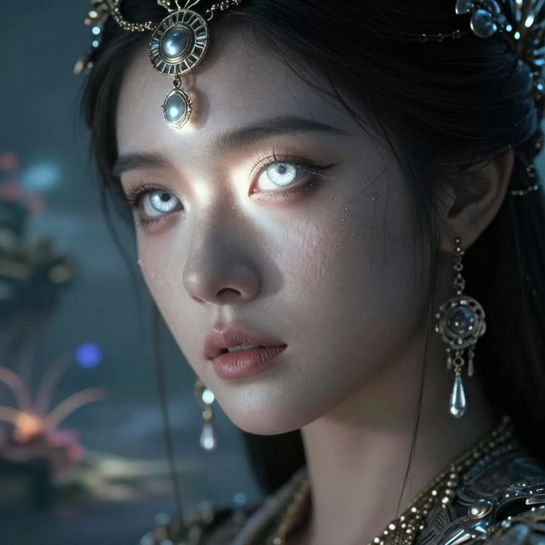 Photorealistic digital artwork of an East Asian woman with pale skin and strikingly glowing blue eyes. She has long, dark hair adorned with intricate metallic headpieces and earrings. Her makeup is subtle, with shimmering highlights on her cheeks. She wears a delicate, ornate necklace and has a central, glowing jewel on her forehead. The background is a blurred mix of dark blues and soft, colorful lights, creating a mystical, ethereal atmosphere. The image focuses on her face, emphasizing her otherworldly, luminous eyes and serene expression.