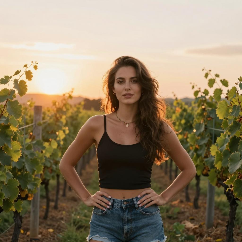 A young woman stands confidently between rows of lush green grapevines in a vineyard during sunset. She wears a black crop top and high-waisted denim shorts, with long wavy brown hair illuminated by the warm golden sunlight. The peaceful vineyard setting enhances the serene and picturesque mood of the scene.