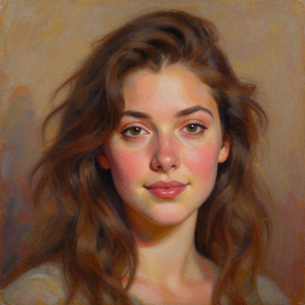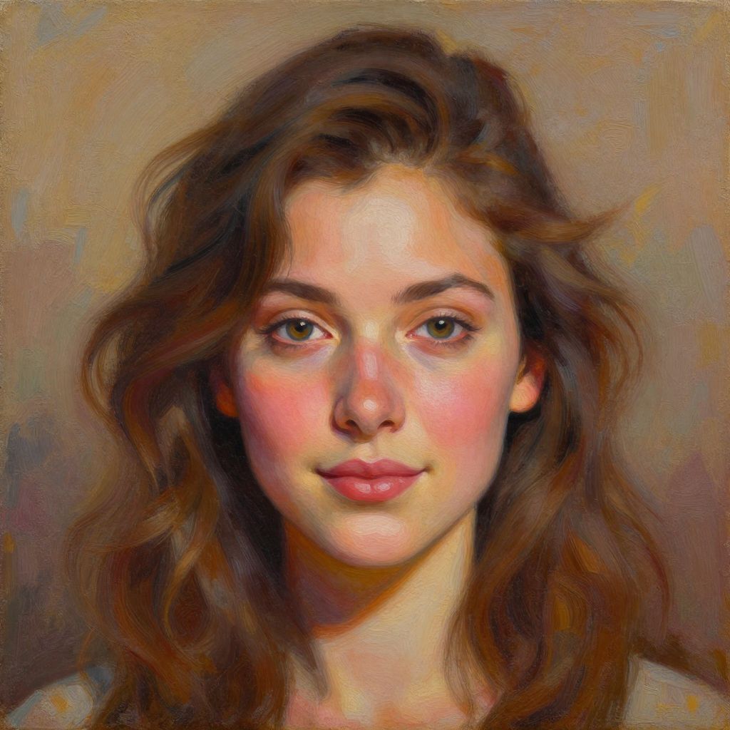 Vibrant oil painting by Nick Alm featuring a detailed portrait of a woman with wavy brown hair, soft blush cheeks, and a subtle smile, set against a textured background with earthy tones.
