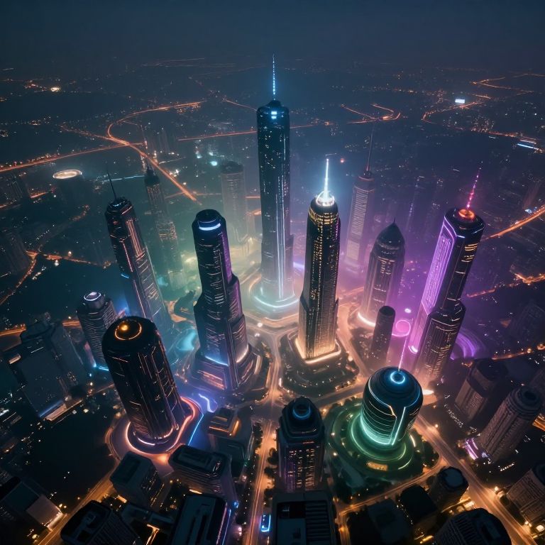 Aerial photograph of a vibrant, neon-lit cityscape at night, featuring towering skyscrapers with colorful LED lights and busy, winding streets.