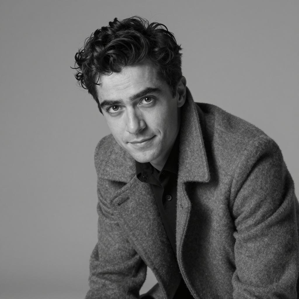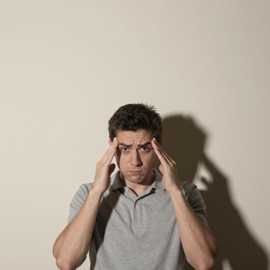 Man with short dark hair and light skin, wearing a pink checkered shirt, holds a large cardboard box over his head. His mouth is slightly open, eyes wide. Background includes a white fireplace with gold accents and black-and-white photographs on top. Man's face is visible through the box's opening.