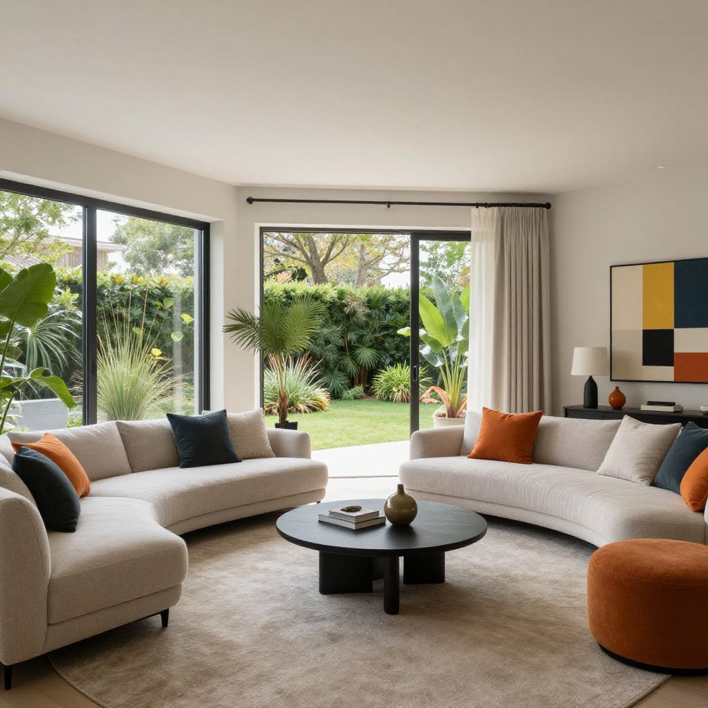 Modernos interior design, spacious living room with minimalist furniture, large floor-to-ceiling windows open to a lush garden, natural light flooding space, neutral tones with pops of vibrant colors, decorative plants, soft textures, modern art pieces adorning walls, cozy yet elegant atmosphere