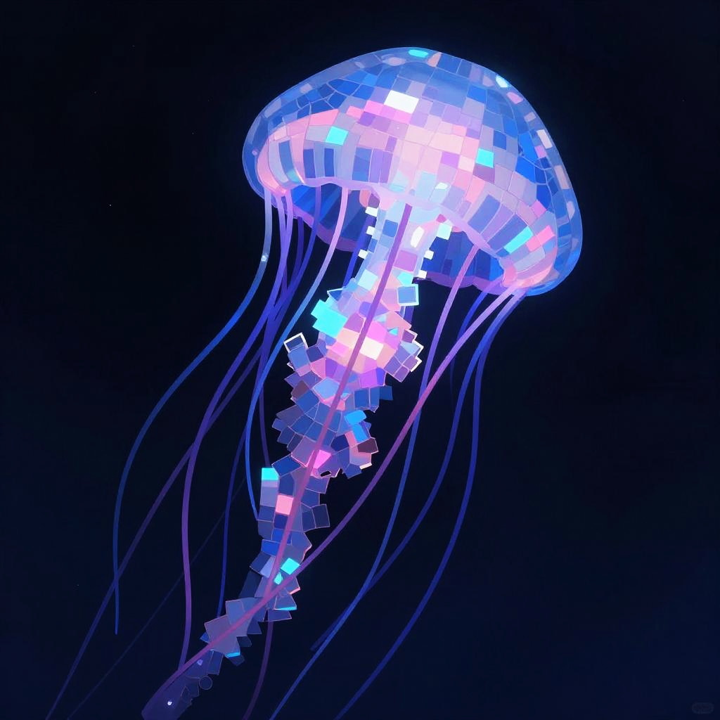 A detailed digital artwork featuring a graceful jellyfish composed of a mosaic of small, colorful glowing tendrils that form a fragmented, pixelated effect. The subject is portrayed in a bioluminescent style, with carefully arranged blocks creating depth and definition. The color palette is vibrant, including shades of neon blue, soft purple, electric pink, teal that reflect light, giving the artwork a luminous quality.