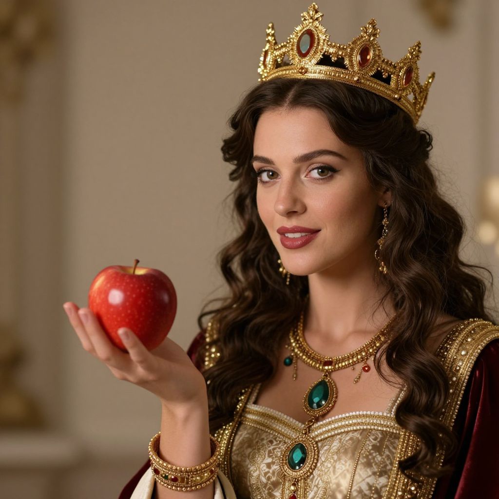 Photograph of a fair-skinned woman with long, wavy brown hair, wearing a golden crown adorned with red and green jewels. She has delicate features, wears gold and green jewelry, and dons an ornate black and gold dress with intricate embroidery. She holds a shiny red apple in her right hand, gazing at it with a serene expression. The background is a softly lit, elegant, white-walled room with classical architectural details. The image exudes a regal, fairy-tale-like ambiance.