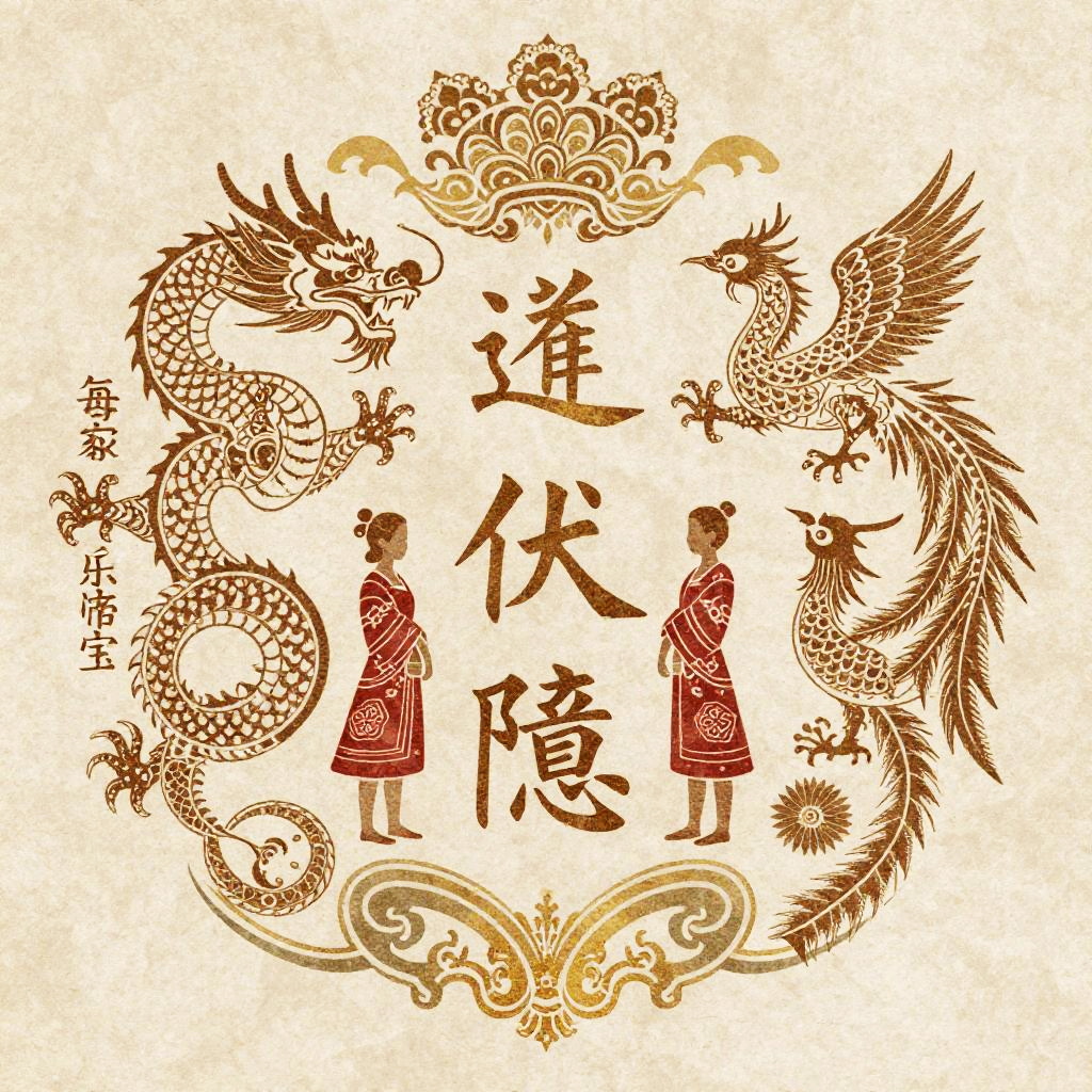 Asian family crest featuring intricate dragon and phoenix motifs, traditional calligraphy symbols, subtle gold and red hues, detailed ornamental patterns on textured parchment background.