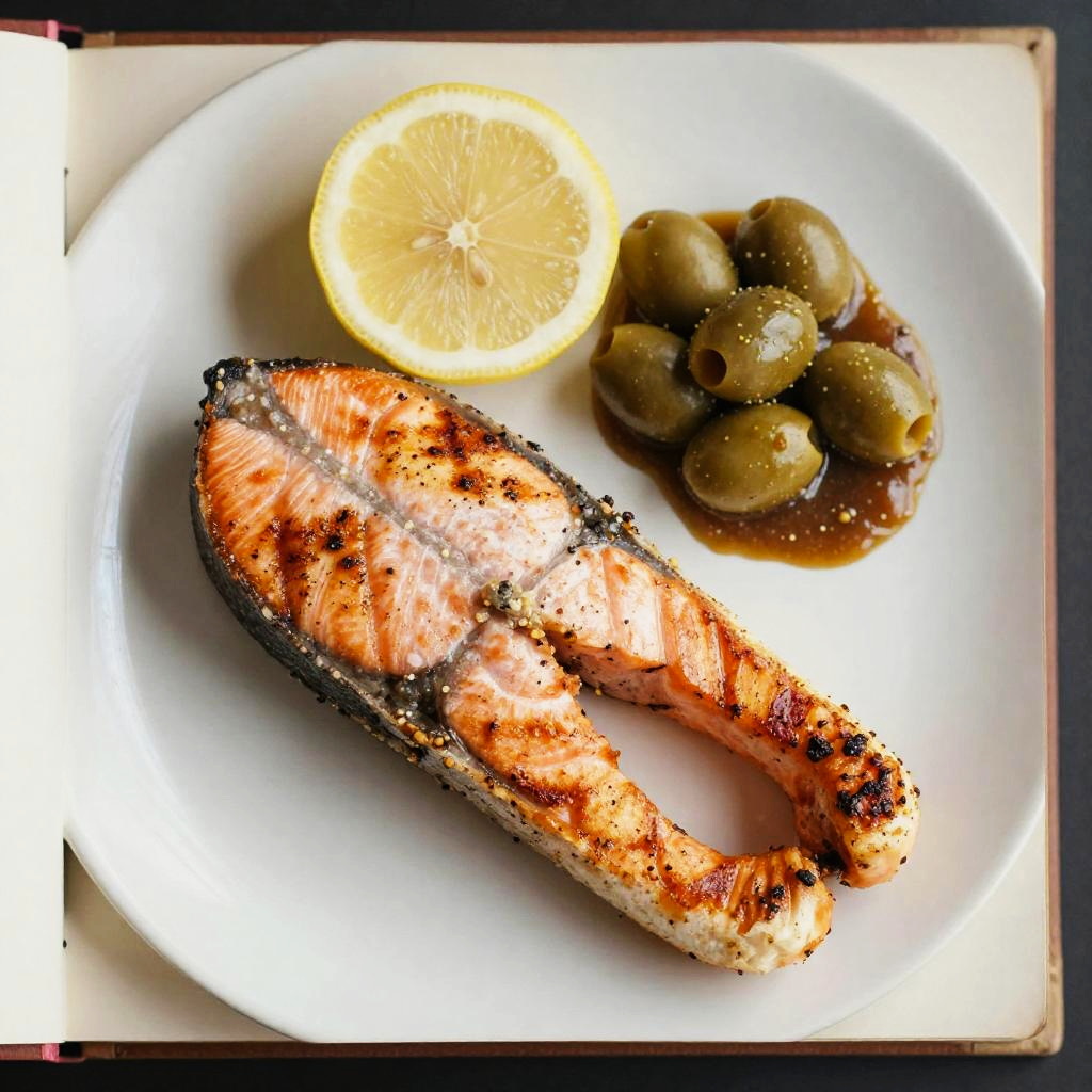 Food photography style, grilled salmon meat, lemon, olives, sauce, 90th photos from photo album, film, vintage style, flash from camera, hyper realistic, fine textures, high quality textures of materials, volumetric textures, natural textures, (natural colors, correct white balance, color correction, dehaze, clarity)