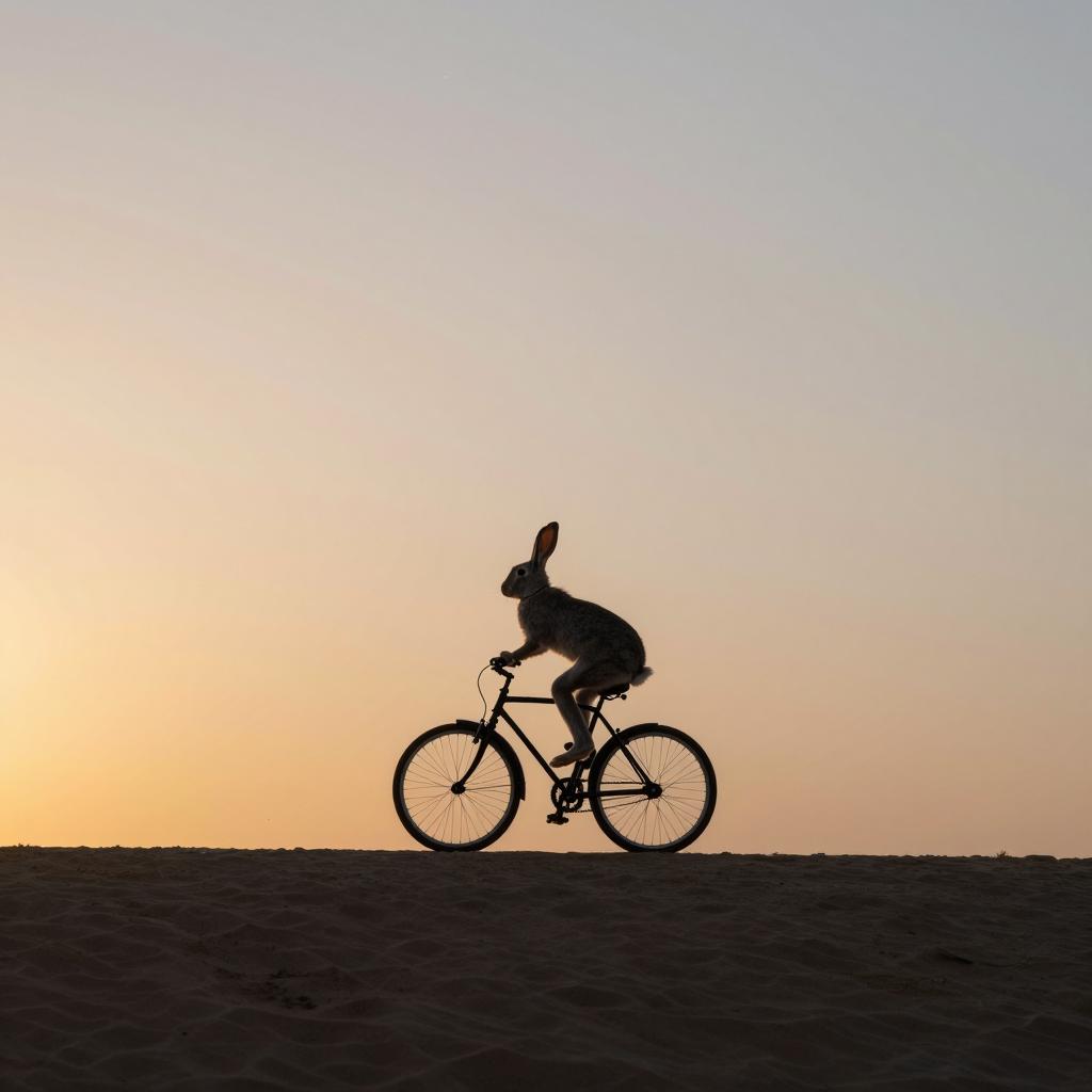 Silhouette of a gray rabbit riding a modern bicycle across a vast desert landscape at sunset. The scene captures the minimalist and serene atmosphere with a clear gradient sky transitioning from warm orange to pale blue. The image evokes simplicity and freedom in a creative and abstract composition.