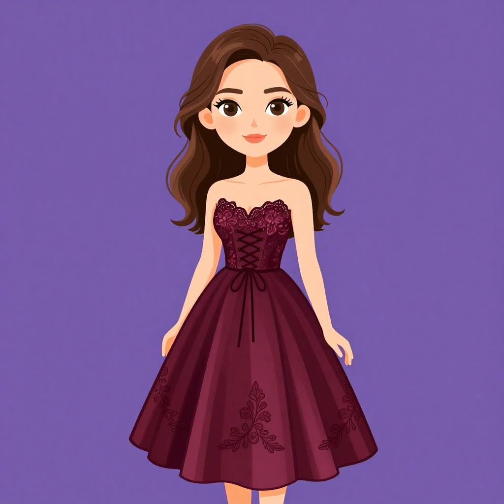 Woman with pretty face and pretty hair. Lace-up design, A-line silhouette, satin fabric, deep burgundy color, intricate lace overlay, sweetheart neckline, adjustable lace-up back, flowing skirt, knee-length, delicate floral embroidery. --sref 1461