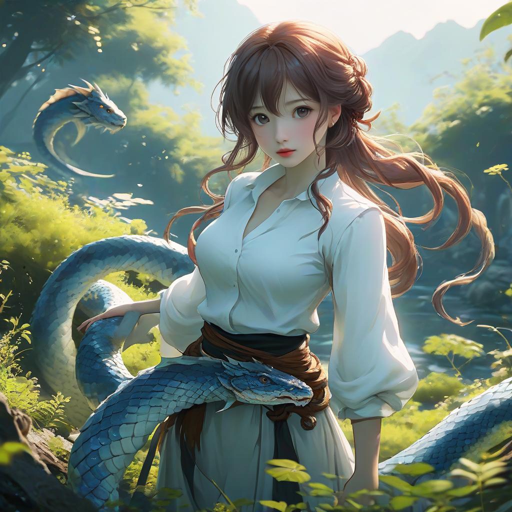 A digital illustration depicts a fair-skinned, young Asian woman with long, brown hair in a white, button-up shirt and grey skirt, standing amidst a lush, sunlit forest. She has large, expressive eyes and a slight blush on her cheeks. Two blue, serpentine dragons with intricate scales wrap around her; one coils around her waist while the other floats behind her. Sunlight filters through the dense foliage, creating a magical, ethereal atmosphere. The woman's expression is calm and composed, and her clothing is simple yet elegant, with a dark sash around her waist. The art style is highly detailed and realistic, reminiscent of fantasy anime.
