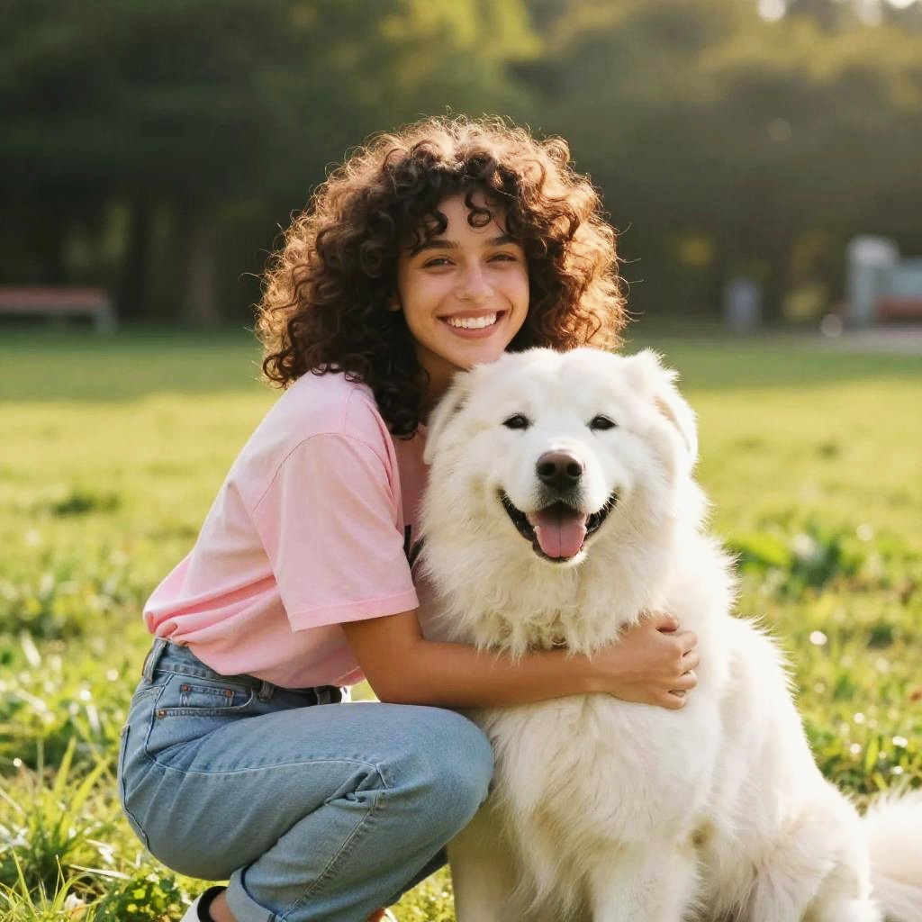 A happy young woman with curly dark hair, wearing a pink shirt and light blue jeans, kneels on lush green grass while hugging a large fluffy white dog. The scene is set outdoors on a bright sunny day with warm natural lighting, blurred trees in the background, creating a joyful and candid atmosphere.