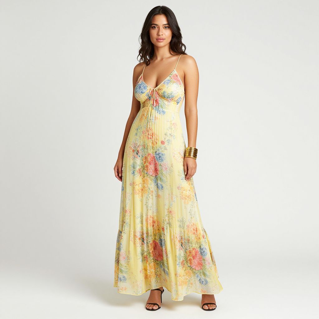 "Woman, bohemian, sleeveless maxi dress in pale yellow with a multicolored floral print, spaghettis straps, scoop neckline, flowy silhouette, ankle length with a subtle ruffle hem, chunky stacked bangle bracelets, black open-toe flat sandals, white studio background.. Sexy. Pretty face and beаutiful eyes. Big breasts."
