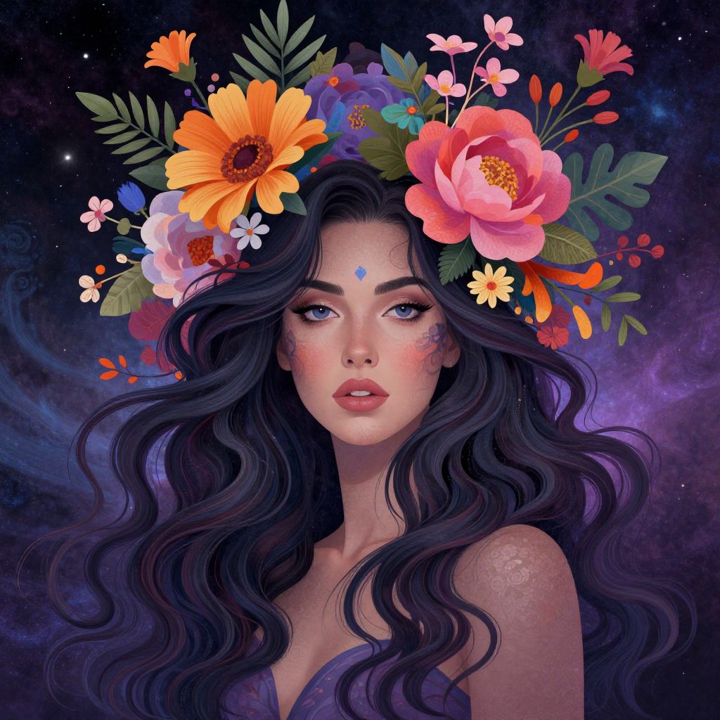 Digital art of a beautiful woman with long, wavy black hair, wearing a vibrant flower crown, against a cosmic purple background.