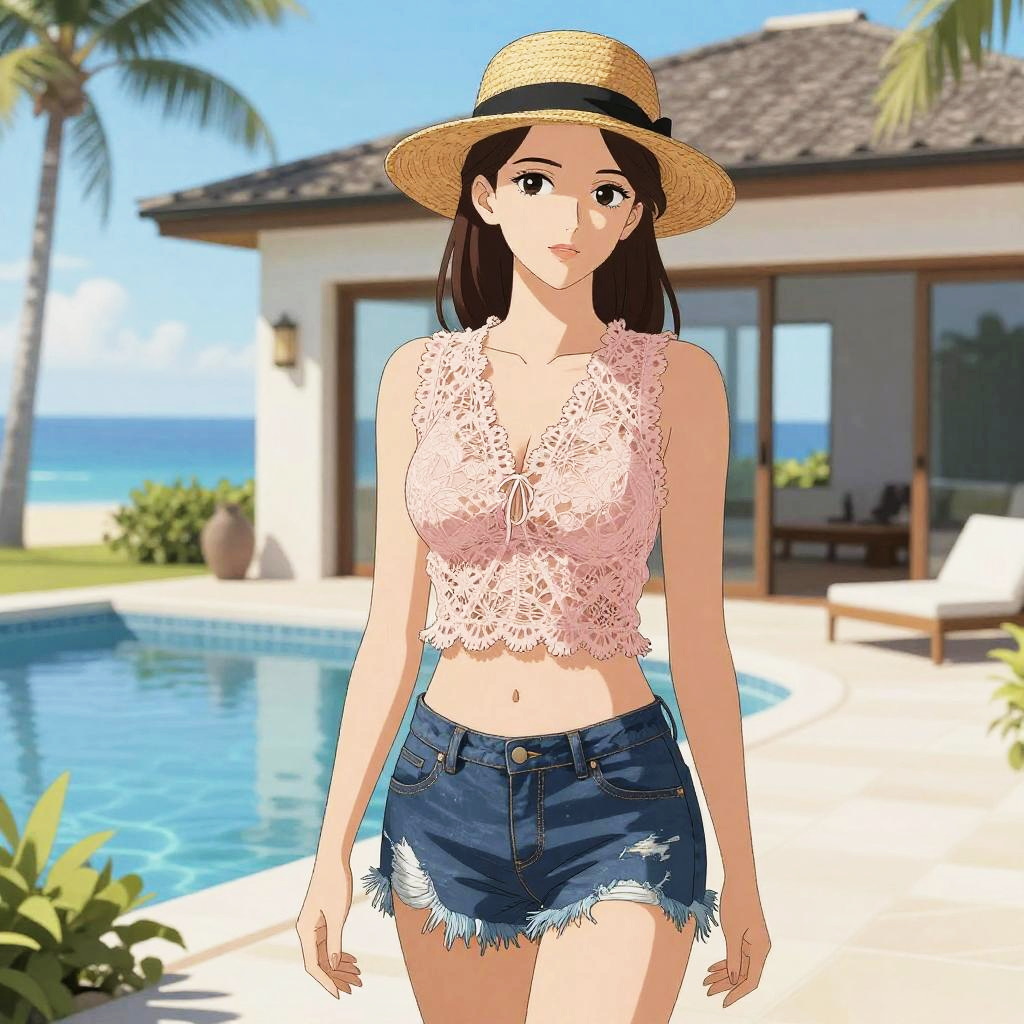 A busty woman in athleisure, wearing a maroon ribbed crop top and high-waisted bike shorts, stands under a gazebo at a wedding venue, illustrated in the style of Kodansha comics. Sexy. Pretty face and beutiful eyes