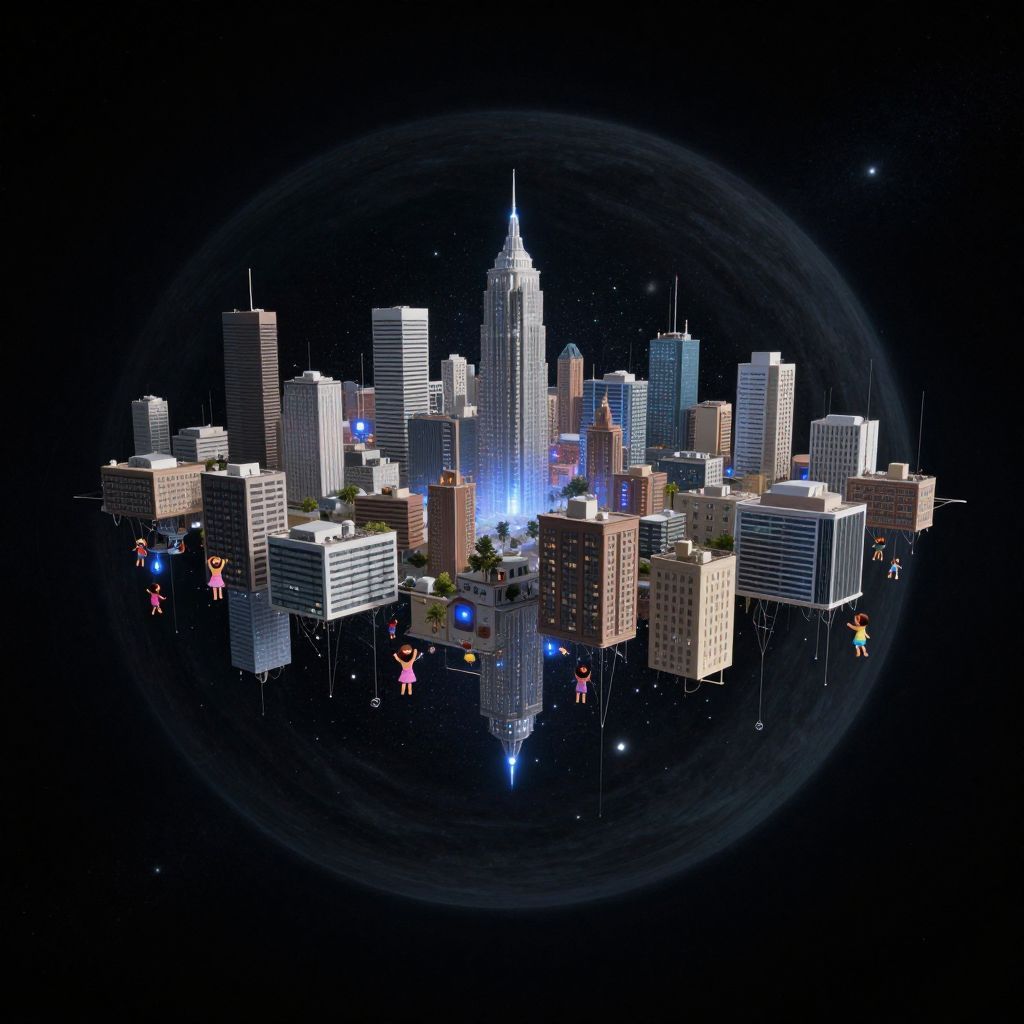 This digital CGI image depicts a 3D, pixelated cityscape floating in space, viewed from an aerial perspective. The city features a mix of tall skyscrapers, including a prominent, illuminated, spire-topped building at the center. Surrounding buildings vary in height and style, with some reflecting blue and white lights. The background is a deep black, dotted with small white stars. A subtle, glowing ring encircles the city, adding a cosmic effect. Small, colorful, pixelated figures are scattered at the base of the buildings, adding a whimsical touch to the futuristic scene.