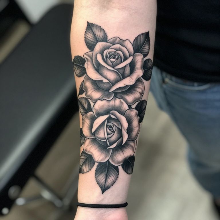 A close-up photo of a black and gray tattoo on a forearm. The tattoo features three large, detailed hibiscus flowers with petals shaded to show depth, surrounded by leaves and small droplet-like accents. The skin beneath is light, and the tattoo rests on a light blue surface. The overall style is realistic with a touch of artistic flair.