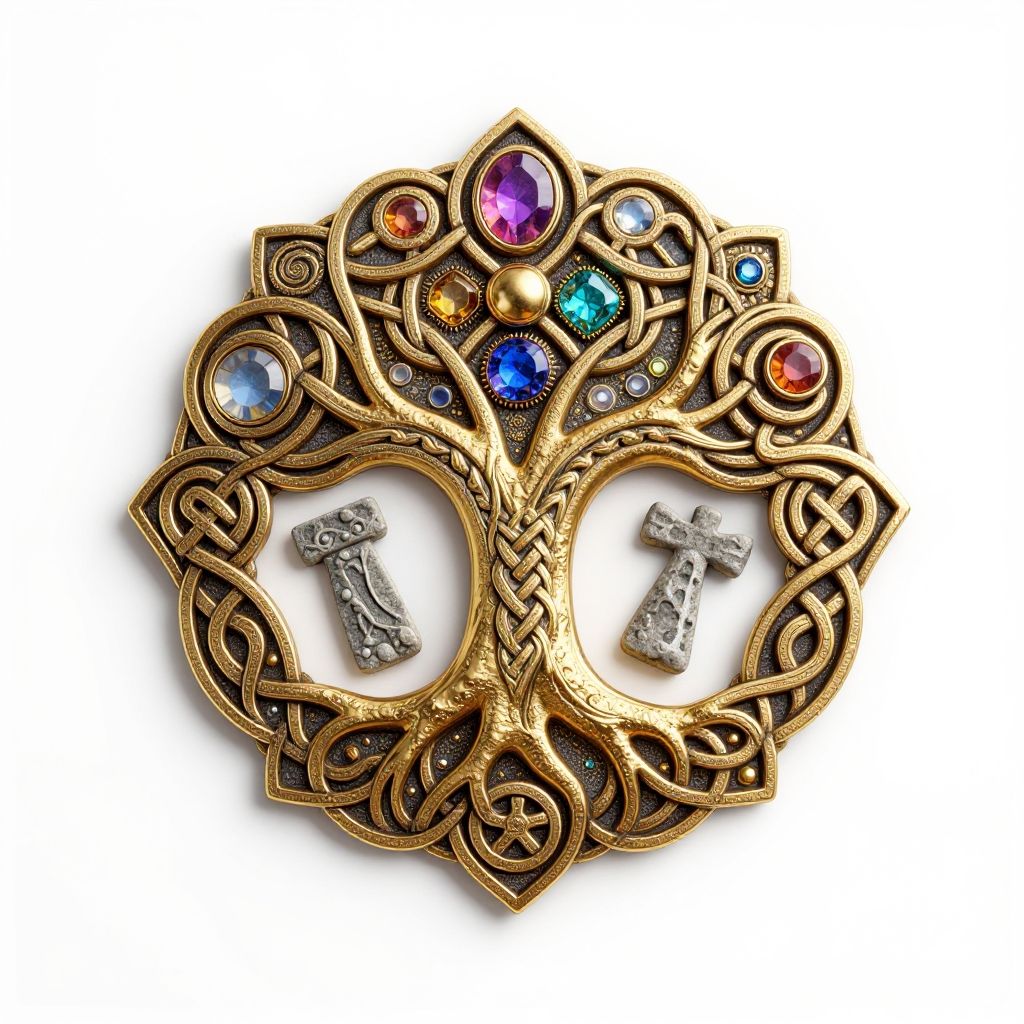 Professional Logo Design, (colorful logo, gemstone design style, Antique), (Celtic knots, Celtic spiral patterns, Celtic cross, hamrock, Celtic stone), Irish, heliocentrism, Druidism, Ancient megalithic civilizations, [twisting ancient tree roots:0.7], amulet, charm, Love and Peace, Antique Gold, SchalenBlende, halcyon, (metallic:1.5), minimalism, modern, elegance, avant-garde, futuristic, ancient, majestic, aesthetic, Abstract, vibrant and fun colors, jewels, ornaments, microchips, computing, absurdres, highres, incredibly detailed, photorealistic, hyperrealistic, shiny, transparent, realistic lighting, Enhanced Lighting Effects, [(details:1.2): [ (many small details:1.3) : [ (many ultrasmall details: 1.2):(very detailed ultrasmall edges and microrelief:1.5):0.7 ]: 0.4 ] :0.2], masterpiece, amazing quality, best quality, high quality, 4K, 8K, 16K, UHD, logoredmaf