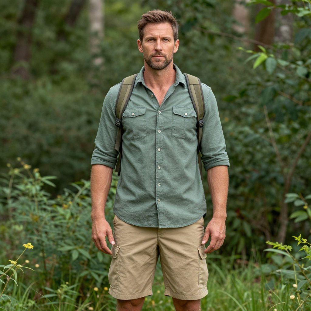 A confident man stands amidst lush greenery, showcasing a rugged outdoor style perfect for adventure. Dressed in a green shirt and khaki shorts, he exudes a sense of exploration and connection with nature, ideal for themes of adventure travel and outdoor lifestyle.