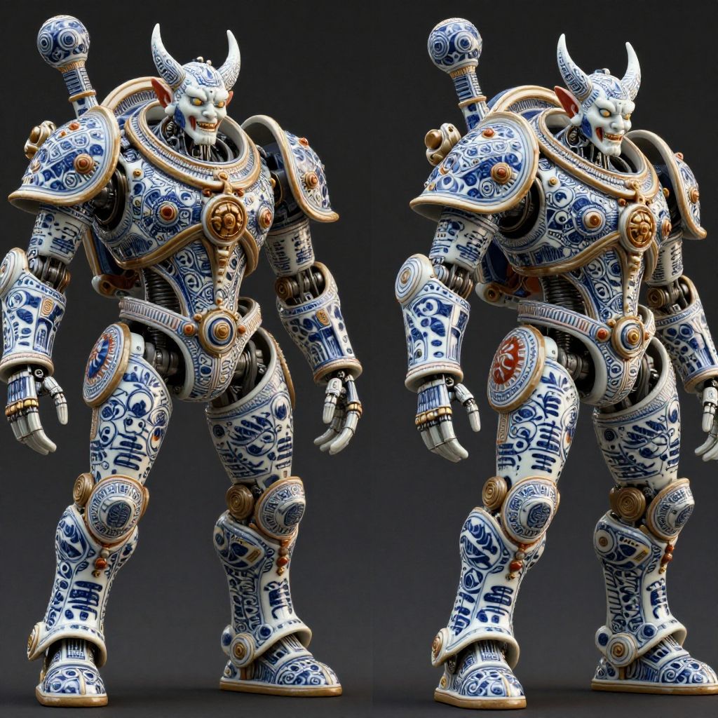 Octane render, different full body model position, Carved porcelain cyborg demons, mechanical warmachine, porcelain patterns in Gzhel style, Miki Asai Macro photography, high detailed cinematic background, close-up, hyper detailed, trending on artstation, sharp focus, studio photo, intricate details, highly detailed