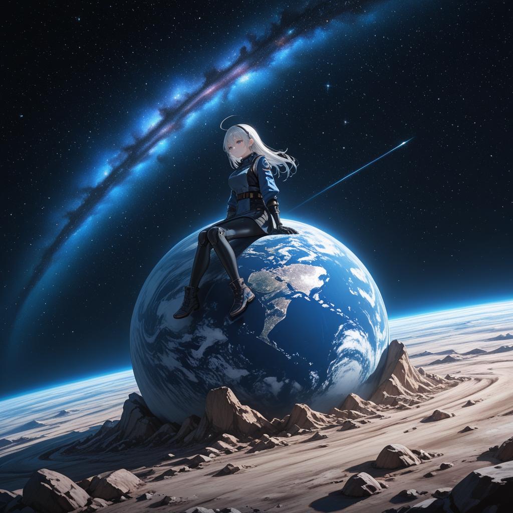 1girl, lwmmg, (gtsplanet:1.2), continents, space background, stars, (sitting on earth:1.2)