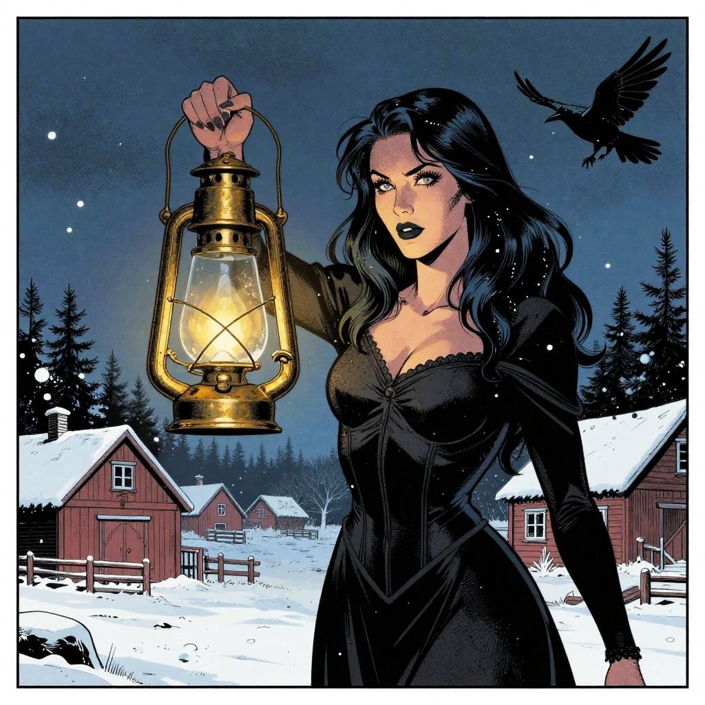 Ice witch with antique brass lantern, raven black hair, Christmas farm, blizzard night, detailed, dark colors, dramatic, graphic novel illustration, 2d shaded retro comic book