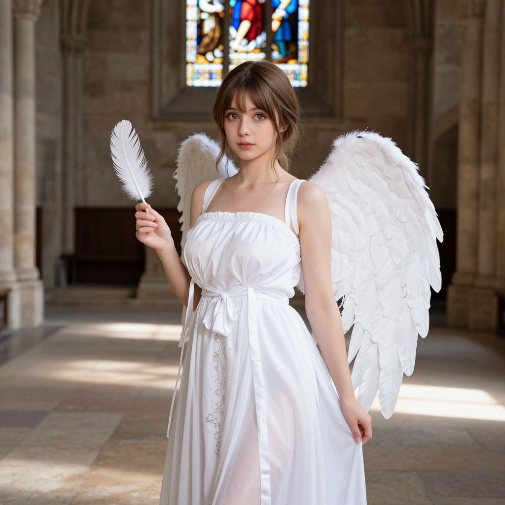 A graceful and serene woman with fair skin and large, expressive hazel eyes stands in a medieval cathedral courtyard, dressed in a white dress angel costume with flowing ribbons and delicate silver embroidery. She holds a white feather gently in her hand, and the soft light from stained glass windows casts long, divine shadows across the stone floor, emphasizing the ethereal quality of her outfit.. The woman has big tits and cute face