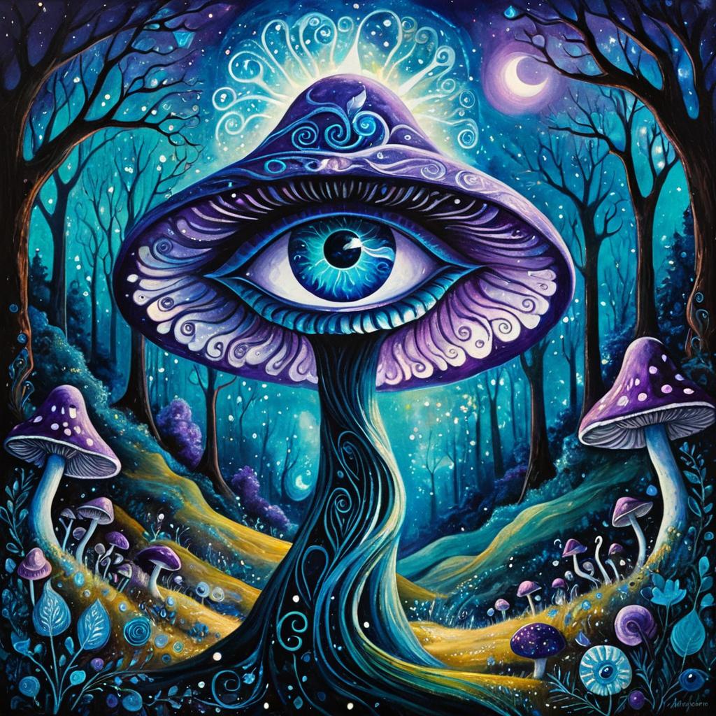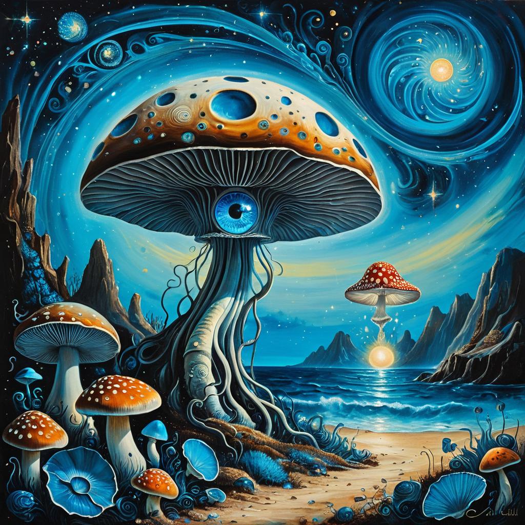 Oil painting inspired by Salvador Dali, honoring Nuit with a mystical scene. Features a fantastical mushroom, a cerulean nautilus shell, and an azure Eye of Horus. Vibrant colors and a dreamy atmosphere with swirling galaxies, ethereal glow illuminating the mushroom, ultra-detailed, high quality, enchanting ambiance