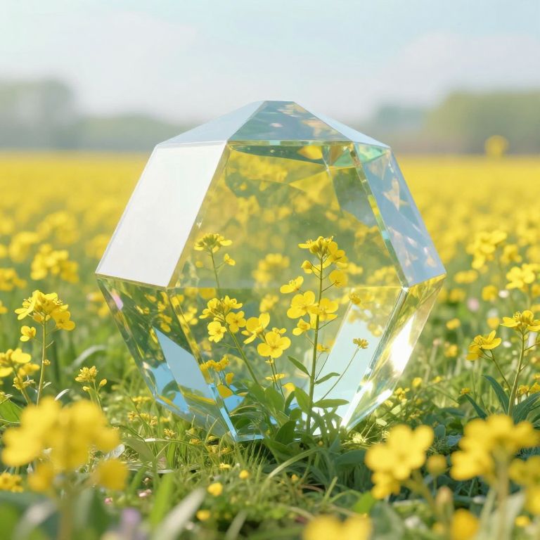 The image presents a surreal, hyper-immersive scene set in a vast, ethereal landscape during a spring morning. Dominating the center is an octahedron, a geometric shape with eight triangular faces, which appears to be made of a translucent material, possibly glass or crystal. The octahedron is filled with vibrant yellow flowers and plants, creating a striking contrast against its clear, reflective surface. The flowers are in full bloom, adding a sense of life and vitality to the otherwise otherworldly setting.