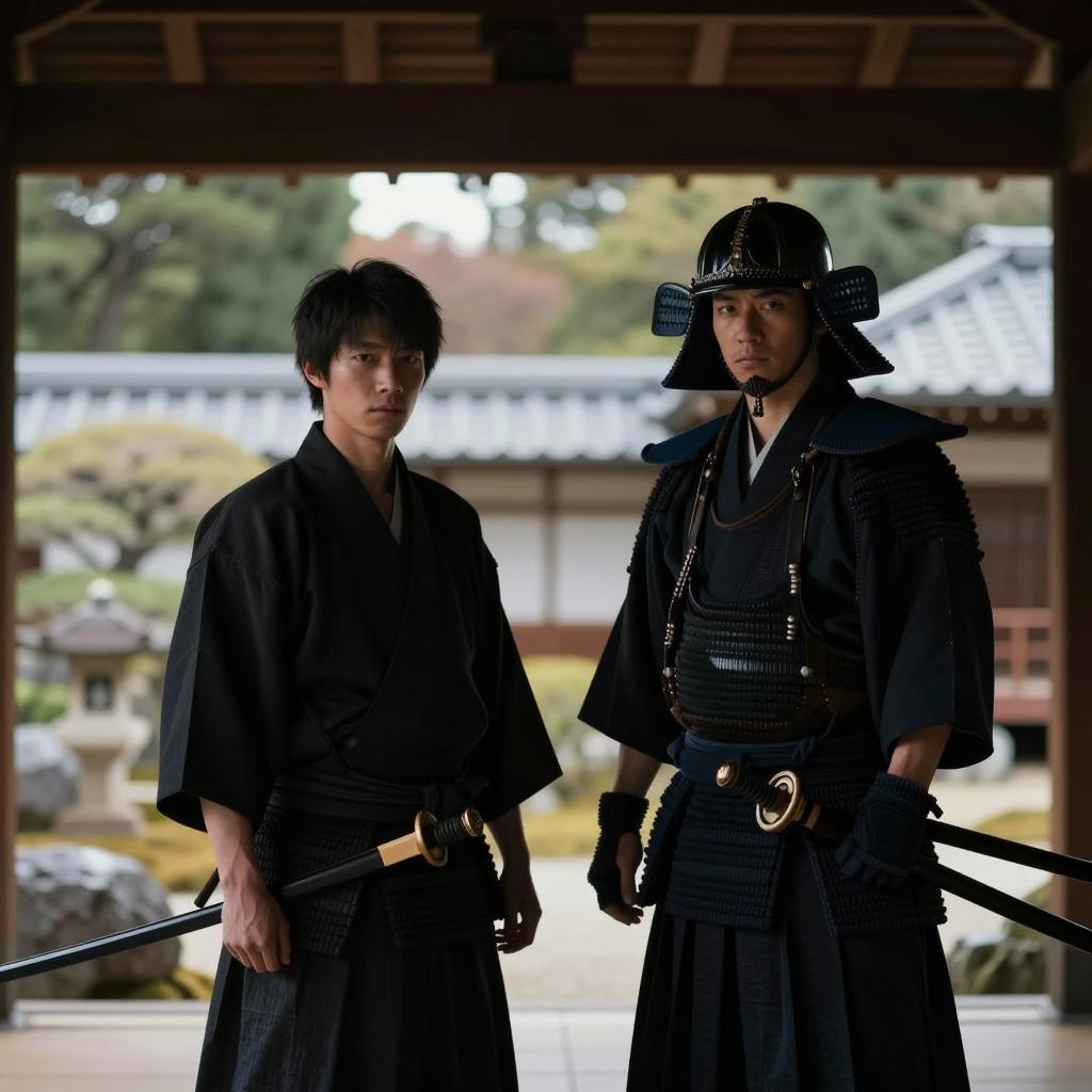 Silhouetted photograph of two Japanese samurai in traditional attire standing under a roof. Samurai on the right holds a sword, facing left. Both have serious expressions. Background shows a garden with trees and a traditional Japanese building.