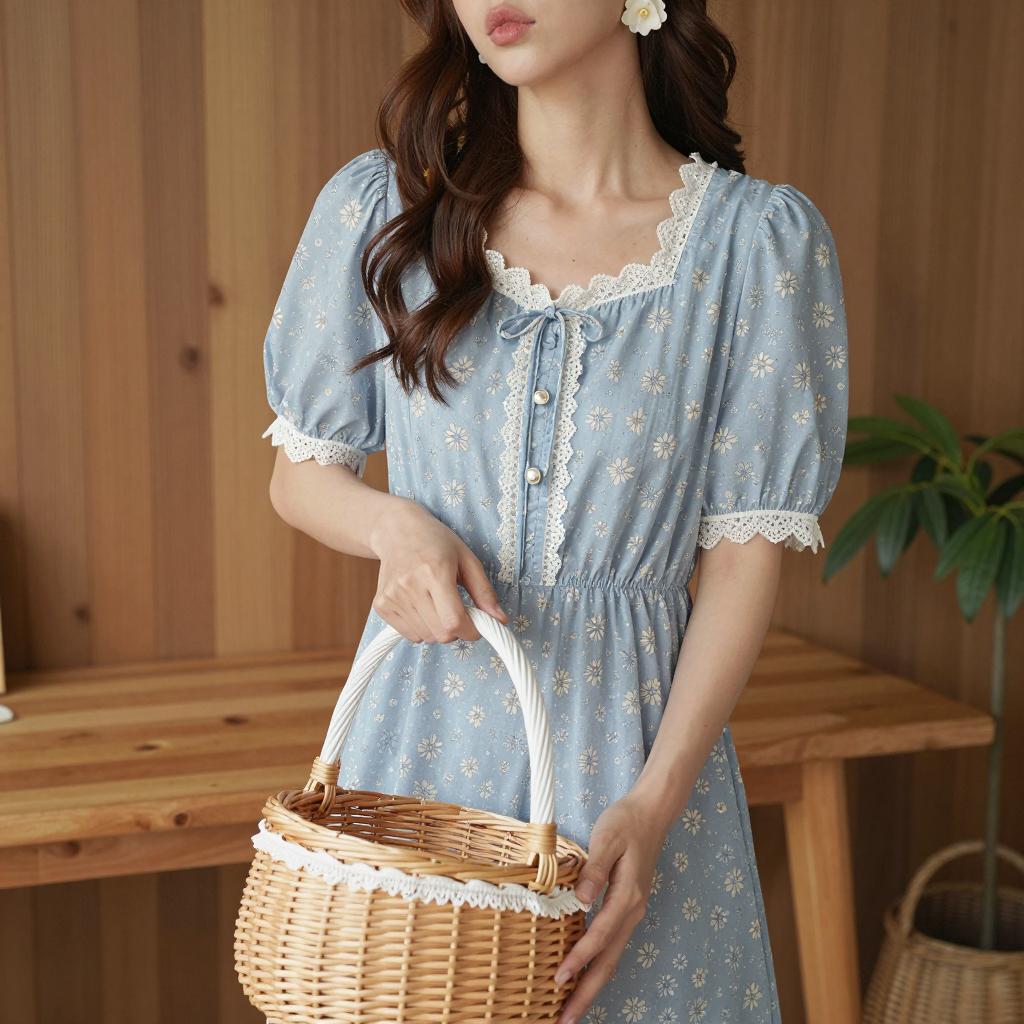 Woman with long brown hair wearing a light blue, floral-patterned dress with puffed sleeves and lace trim. She holds a wicker basket with a white handle. Wooden wall in the background. Her lips are slightly pursed. White floral earrings. She stands with a slight forward lean. Right hand grasping basket handle. Left hand resting on basket. Potted plant to the right. Light brown wooden table in background.