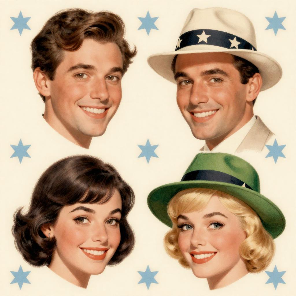 Vintage illustration of four people's faces. Top left: smiling man with dark hair, brown eyes, light skin. Top right: smiling man with dark hair, light skin, wearing a light-colored suit and star-patterned hat. Bottom left: smiling woman with dark hair, light skin, red lips. Bottom right: smiling woman with blonde hair, light skin, wearing a green hat. Background: light yellow with blue star patterns.