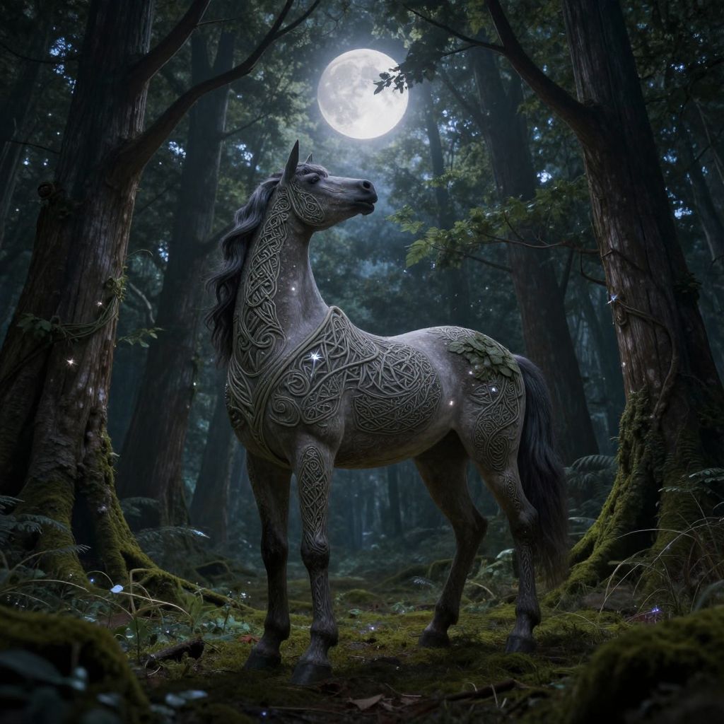 A detailed, full-body, dark gray horse with intricate Celtic patterns stands under a glowing full moon in a mystical, moonlit forest. Digital art.