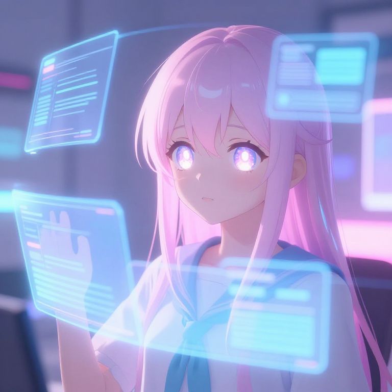 Anime photo ai illustration of a young girl with glowing eyes using holographic AI interface, futuristic room with floating screens, soft pastel colors mixed with bright neon, anime style with photo-realistic shadows, ambient lighting