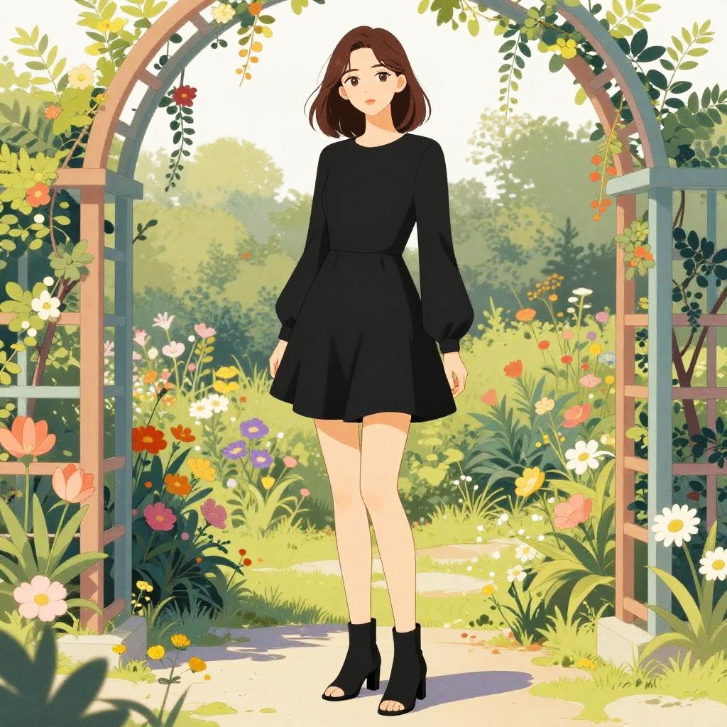 A woman in a minimalist chic black skater-style mini dress with long sleeves and flared skirt, paired with black open-toe ankle booties, standing in a vibrant flower garden with a colorful trellis, illustrated in the style of Kodansha comics. Sexy. Pretty face and beutiful eyes