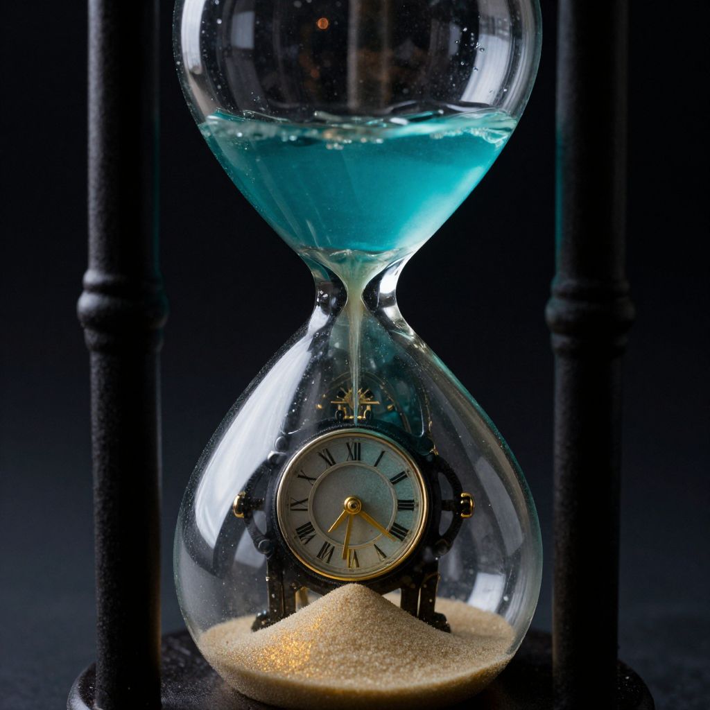Giant hourglass stands tall with a clock face above, sand cascading through its transparent glass as four children play joyfully around its base under a clear blue sky.