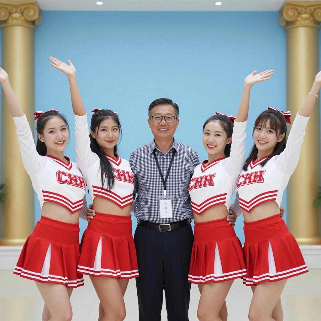Six female dancers in red and blue tops, white denim shorts, and white sneakers perform a dynamic routine in unison. They lean forward with arms crossed, legs extended. Background has blue curtains with silver stars and red star decorations. Dancers wear headbands, some with stars. Wooden stage floor.